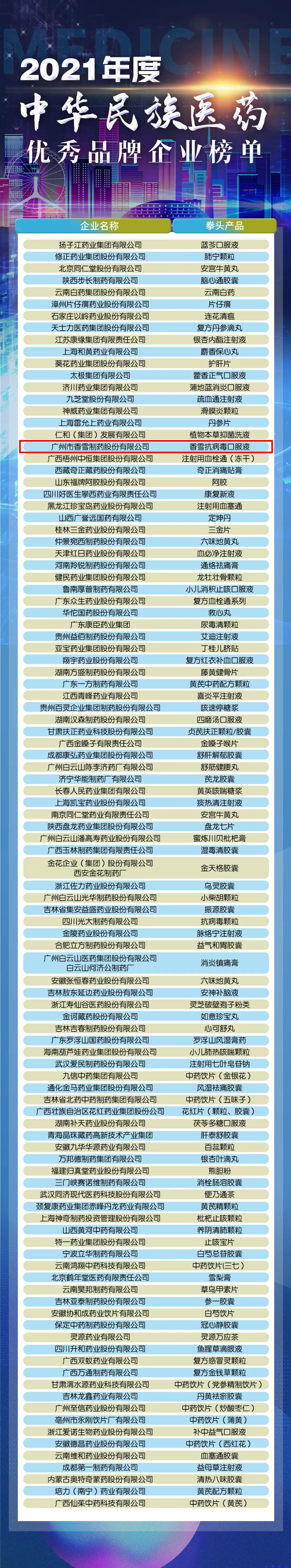 该榜单面向全国中成药生产企业、饮片生产加工企业,通过企业申报以及网络数据分析等途径,经过全国工商联医药业商会秘书处统计整理,综合企业销售额、品牌产品、科研、创新、国际化程度等因素,报评审委员会评选出“2021 年度中华民族医药优秀品牌企业”。