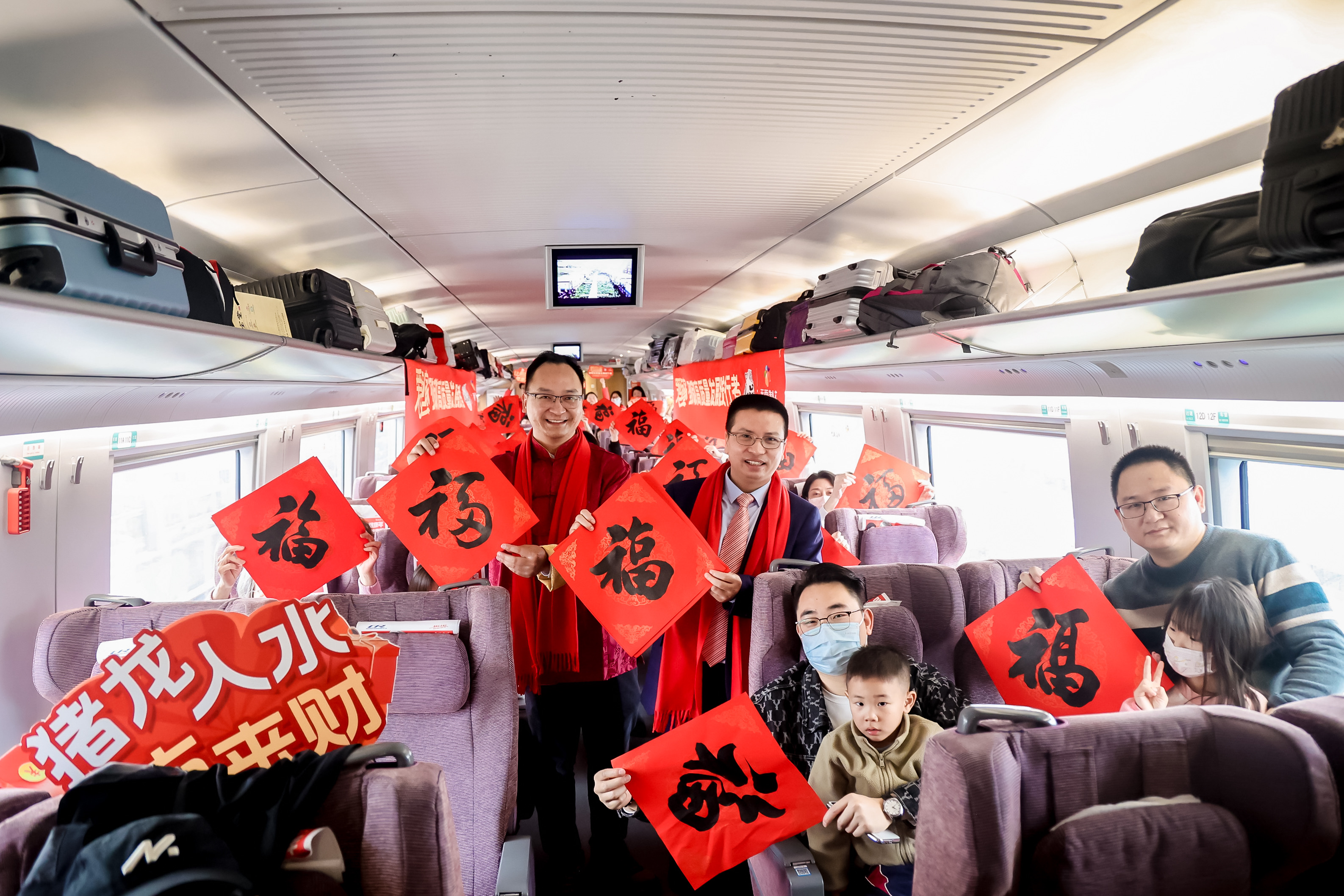 在这场奔赴亲情,共享美好的旅途中,一场场围绕着特色传统文化的互动在车厢内浓情开启。由志愿者用小提琴演奏的《孤勇者》,乐曲激昂有力,感染着每一位在场的践行者。“龙年龘龘”、“猪龙入水,八方来财”,人们手举着一块块写着对新年美好祝福的KT板,用手机的快门,留下过年前归乡的喜悦。