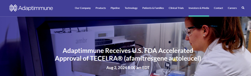 8月2日,Adaptimmune Therapeutics公司宣布其TCR-T细胞疗法TECELRA(Afamitresgene autoleucel,Afami-cel)获FDA批准上市,用于二线治疗既往接受过化疗治疗的不可切除或转移性滑膜肉瘤成人患者, TECELRA是全球首款获批上市的治疗实体瘤的工程化T细胞疗法,也是全球首款获批上市的TCR-T细胞疗法,具有重大里程碑意义,给晚期滑膜肉瘤患者带来“变革性”治疗手段的同时,也填补了TCR-T赛道治疗实体瘤的空白,提振了行业信心。