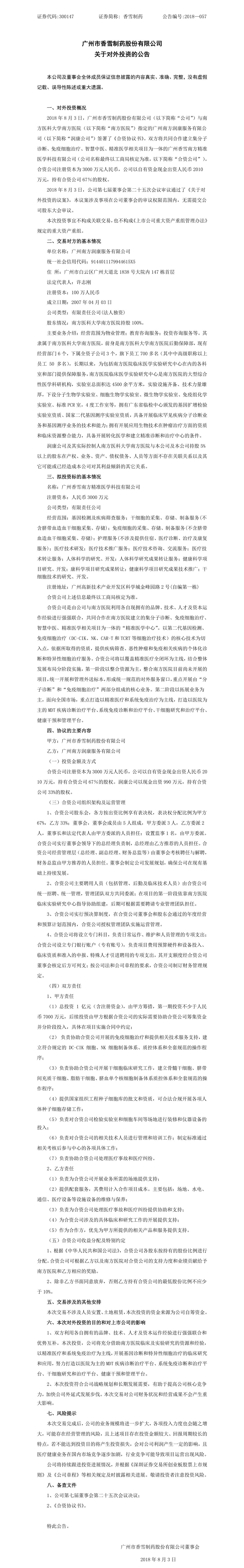 2018年8月3日晚间,上市公司ylzz总站线路检测中心(300147)发布公告,与南方医科大学南方医院指定的广州南方润康服务有限公司签署了《合资协议书》。双方将共同合作建立集分子诊断、免疫细胞治疗、智慧中医、精准医学相关项目为一体的广州ylzz总站线路检测中心南方精准医学科技有限公司。合资公司总投资1亿元人民币,其中注册资本为 3000 万元,公司以自有资金现金出资人民币 2010万元,持有合资公司 67%的股权。