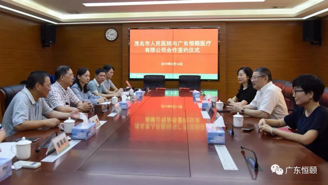 2019年5月14日下午,茂名市人民医院与广东恒颐医疗有限公司签署战略合作协议,建立联盟合作关系,开启合作新征程,建立以茂名市人民医院为中心的医联体。茂名市人民医院院长梁岩、广东恒颐医疗有限公司董事长黄滨及公司高管参加签约仪式。