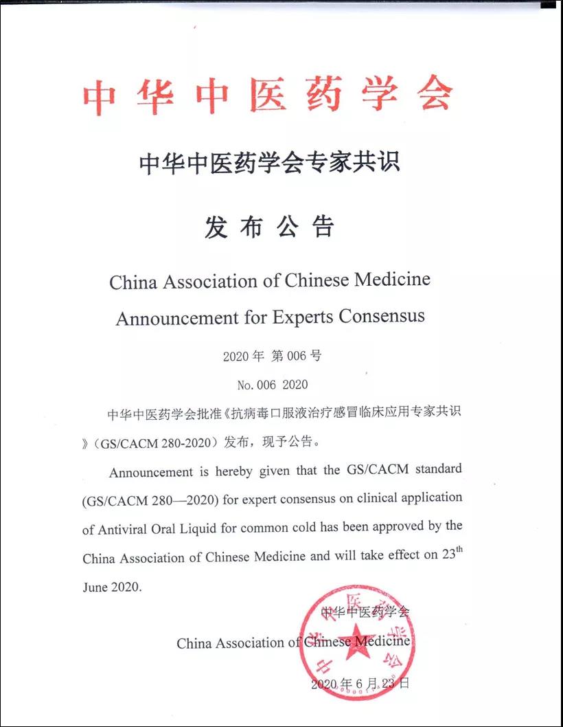 为进一步做好中医药标准化工作,总结中成药临床应用的优势与特点,全面收集专家的临床应用经验及中成药循证医学证据,形成共识,为中医临床诊疗指南制修订工作提供参考,中华中医药学会标准化办公室组织临床、药学、方法学专家对《抗病毒口服液治疗感冒临床应用专家共识》和《抗病毒口服液治疗流感临床应用专家共识》进行了函审,函审结果为通过审查,经学会办公会审批,现予以公告。